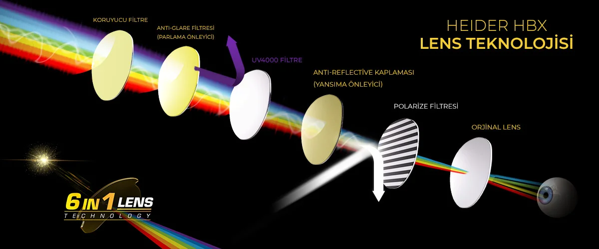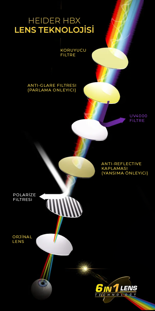 Gece/gündüz günün her saatinden keyif alın. Yüksek Alman teknolojisi ile tasarlanan yeni Heider HBX, ışık yansımalarını engeller, kontrastı arttırır ve 6 farklı özel filtresi sayesinde gözlerinizi zararlı UV ışınlarından korur.