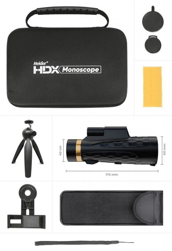 Heider HDX Monoscope, özellikle hassas ve uzak kara gözlemlerinde kullanılan, Alman standartlarında tasarlanmış, son derecede gelişmiş optik teknolojiler ile üretilmiş benzersiz bir monoküler kara teleskobudur. “Monoscope” kelimesi “Monocular” ve “Telescope” kelimelerinin kısaltılmış adıdır. “HDX” ise yüksek netlikte görüntü olduğunu ifade eden model ismidir.