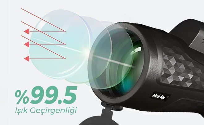 Heider HDX’te bulunan Anti-reflection green coating (yansıma önleyici yeşil kaplama) esasen ışık iletimine yardımcı olmak için tasarlanmıştır. Böylece daha iyi kontrastlı, daha parlak bir görüntü elde etmeye yardımcı olur. Heider HDX Monoscope, bu kaplama özelliğini kullanarak daha net ve daha parlak bir görüntü elde etmek için ışığı mükemmel bir şekilde toplar. Aynı zamanda, doğrudan gelen ışığının kırılımıyla yansıyan ışık oranının %2’den az olmasını sağlar.