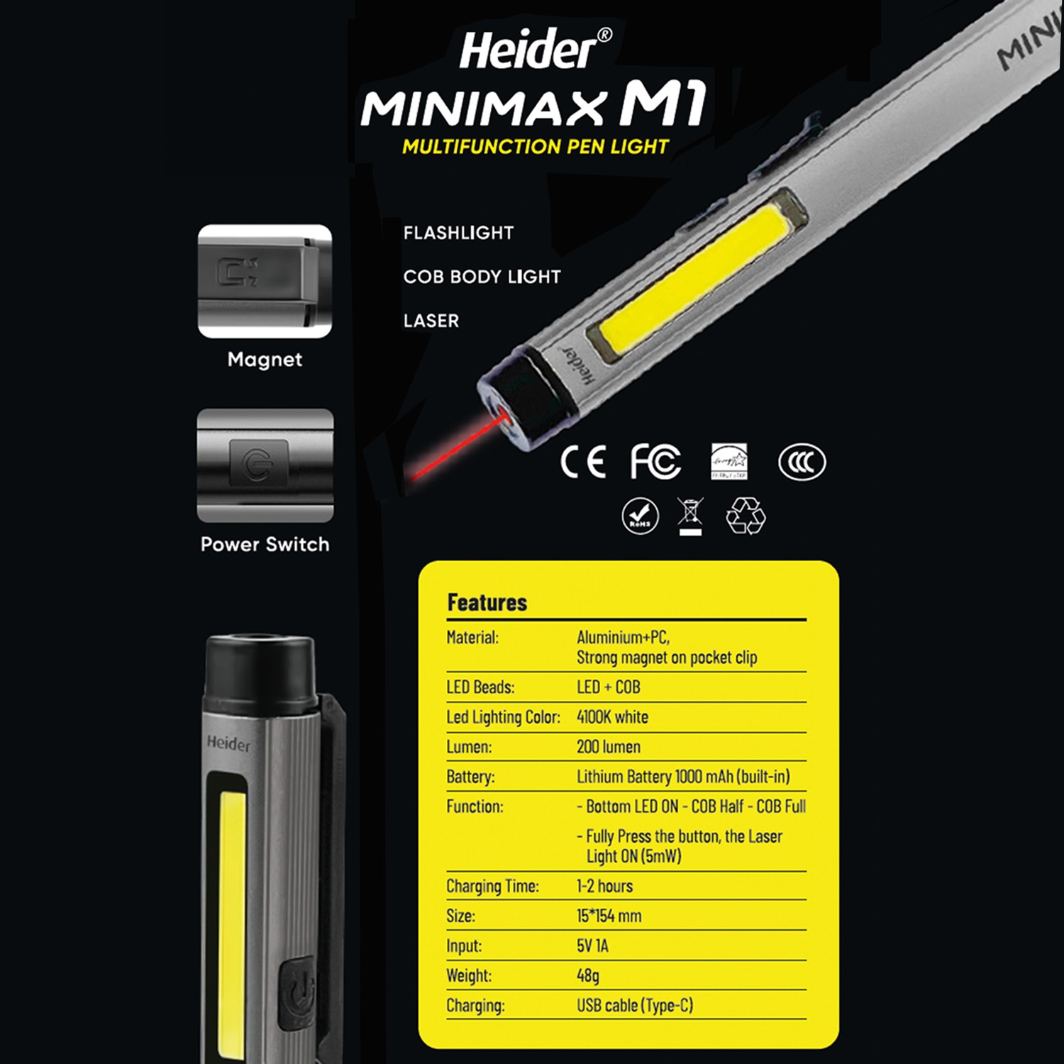 Heider Minimax M1 Özel Metal Tasarım 3 Fonksiyonlu (Lazer + 50 m2 Gövde Lambası + El Feneri) CE+RoHS